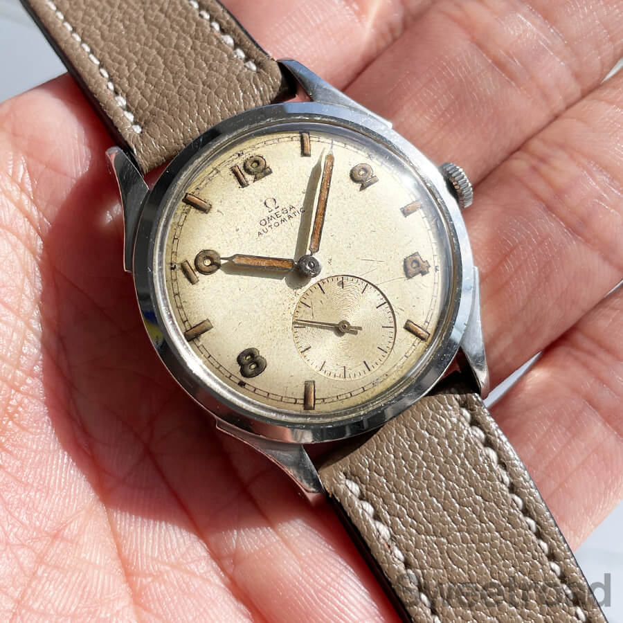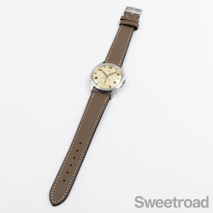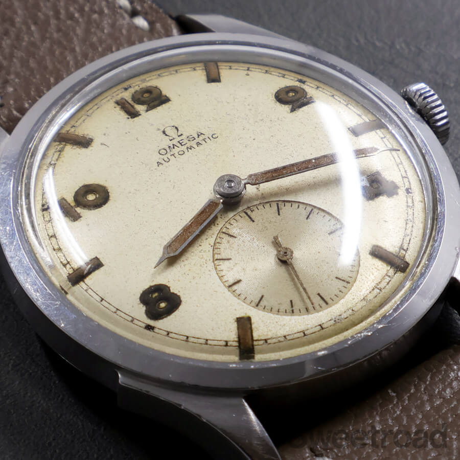 文字盤は雰囲気良くエイジングした飛びアラビアダイヤル。