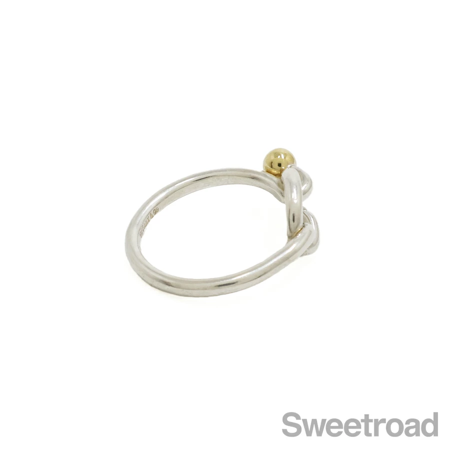 ティファニーの人気コレクション、フックアンドアイの「ラブノットリング」。 18金イエローゴールドと925シルバーのコンビモデルで、ティファニーらしいデザインが魅力的なアイテムです。 シルバー特有の小傷はございますが、雰囲気を損なうようなダメージはございません。 内側のブランド名や素材を表す刻印はしっかりと残っています。