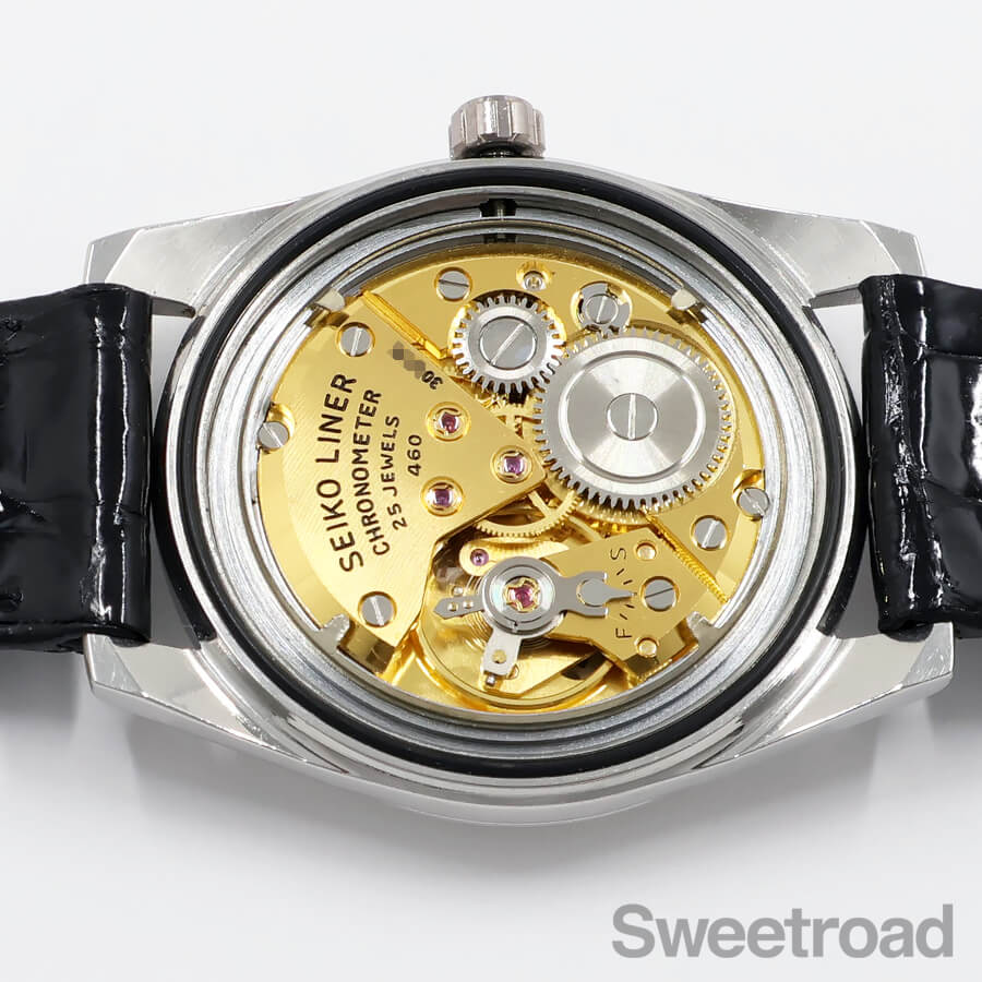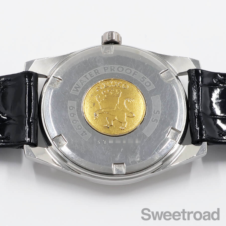 「W SEIKO」の純正リューズも残っており、裏蓋の刻印、獅子メダリオンもはっきりと読み取れる状態です。