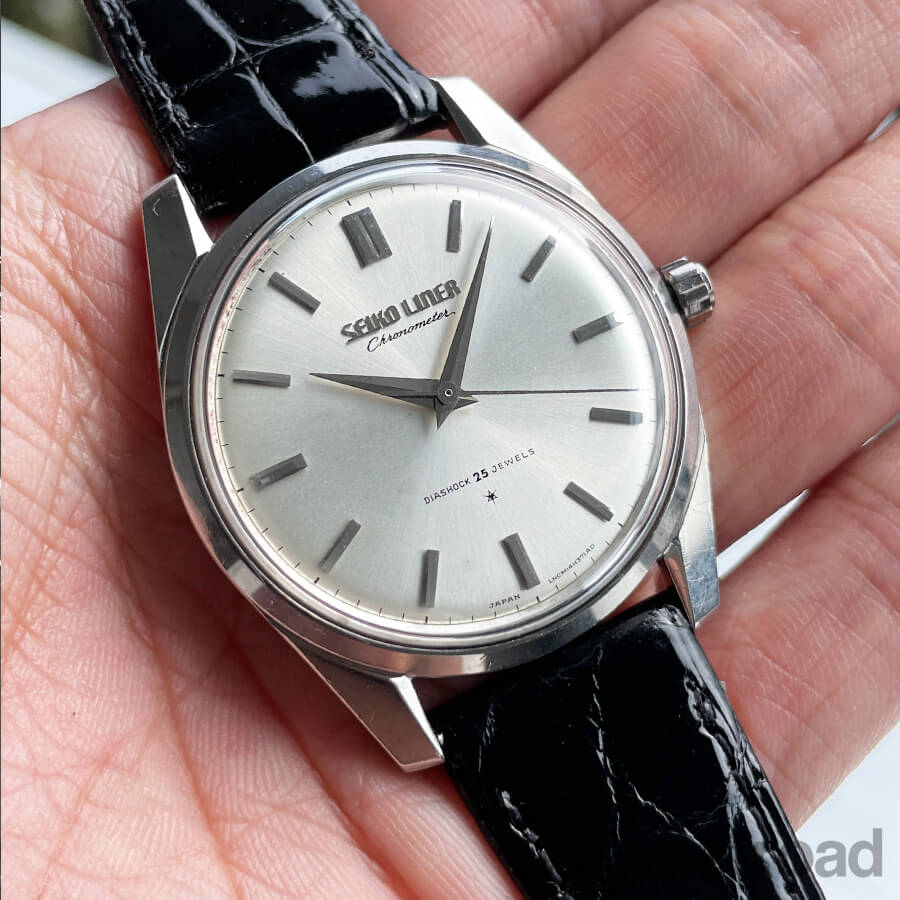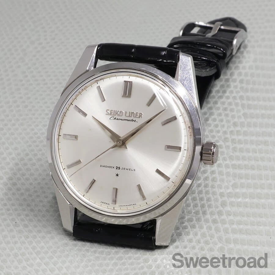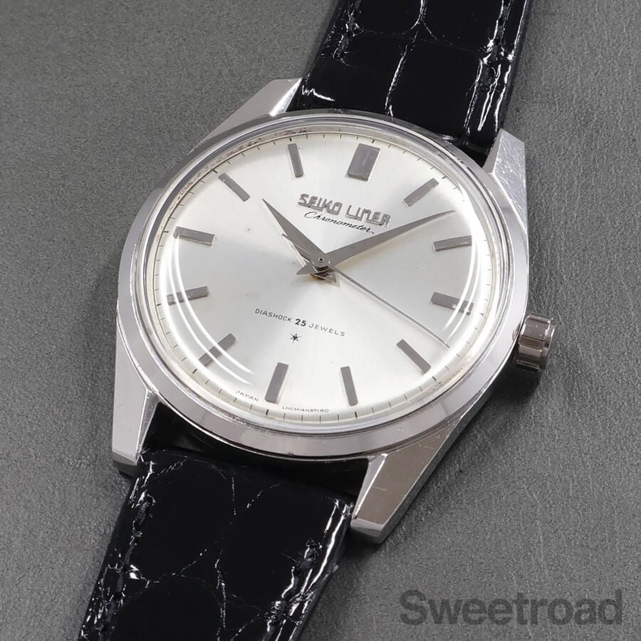「薄型=高級」が流行した1960年代に、諏訪精工舎で製造された「ライナー」のクロノメーターモデルで、歩度証明書を付けて販売された当時の高級機です。