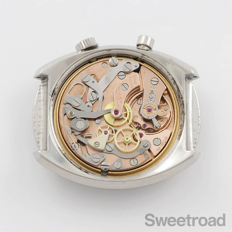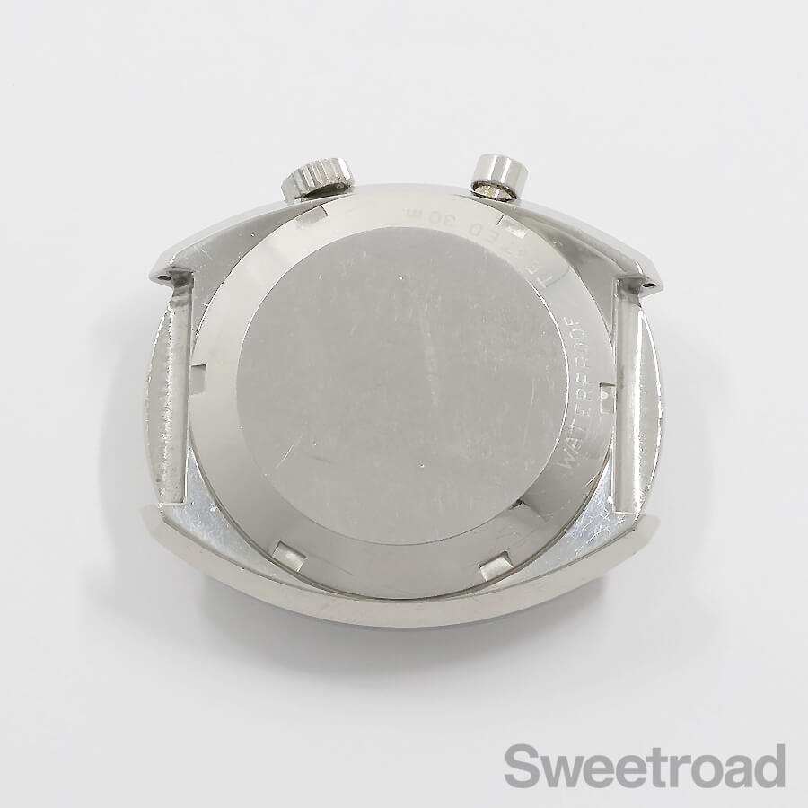 ケースフォルムや前面のヘアライン仕上げは残っており、裏蓋の刻印もはっきりと読み取れる良好なコンディションです。