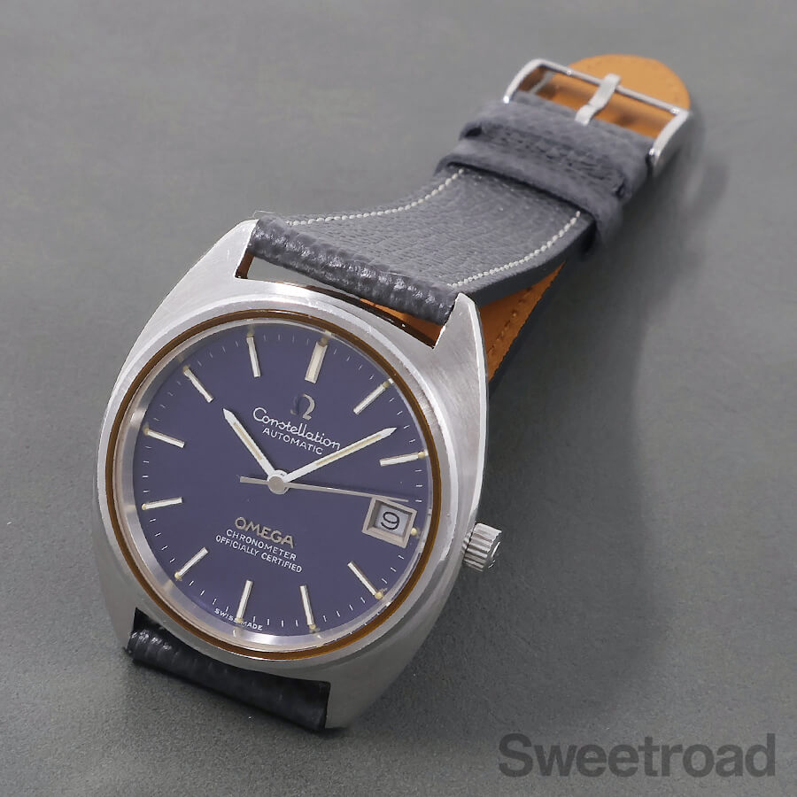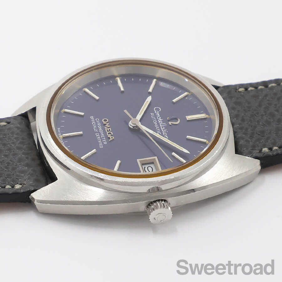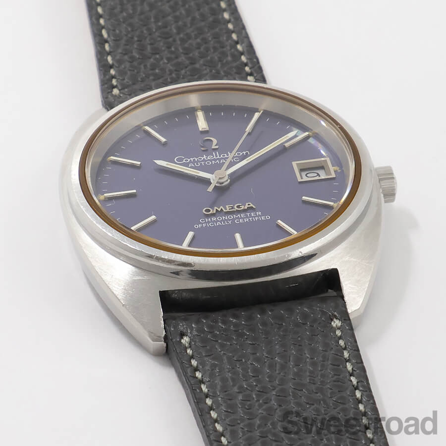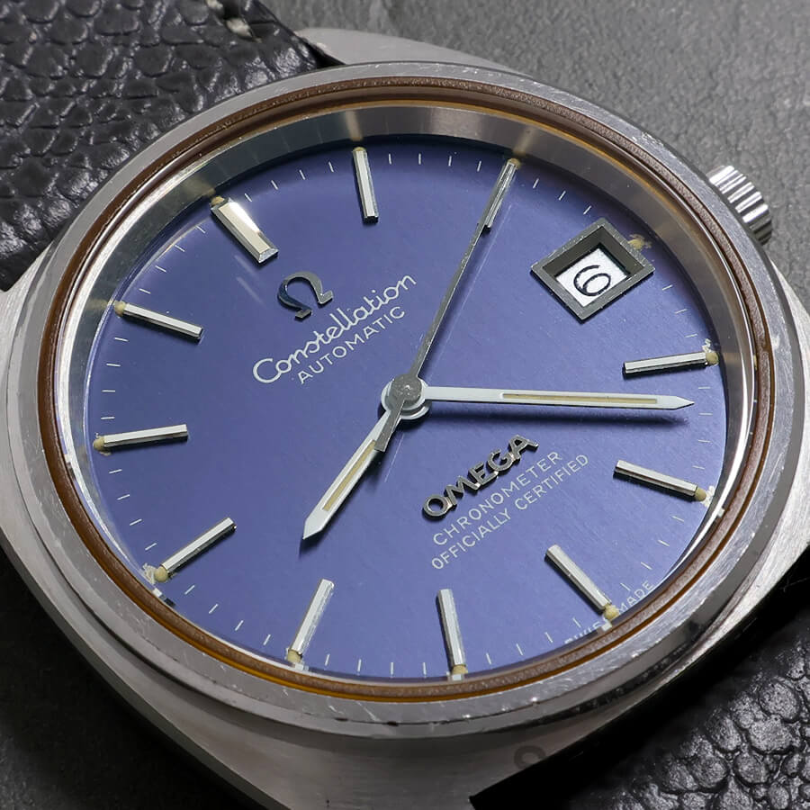 通称「Cライン/ジェンタ」と呼ばれる、オメガ・コンステレーションが入荷しました。 パテックのノーチラス、オーデマピゲのロイヤルオークなどを手掛けた「ジェラルド・ジェンタ氏」がデザインした、非常に人気のあるモデルです。 本商品は、OMEGAロゴやクロノメーター表記が6時側に配され、フラットなガラス風防が採用された後期型の個体です。 希少性の高いブルーダイヤルが採用されており、ホワイトカラーの針やインデックスが良いアクセントになっています。 Ωロゴに焼け、インデックス夜光周りにわずかな剥がれこそございますが、その他は目立つような傷みの見られない綺麗な状態を維持しています。 外装は細かな小傷が見受けられますが、打痕などの過度なダメージはありません。 ケースエッジやヘアラインは残っており、フォルムが維持された良好なコンディションです。 ムーブメントは、デイト付きクロノメーターキャリバー「1011」を搭載しています。 ベルトは、アキュレイトフォルムのレザーベルトが装着されています。 当店にてOH(分解掃除)を行っております。