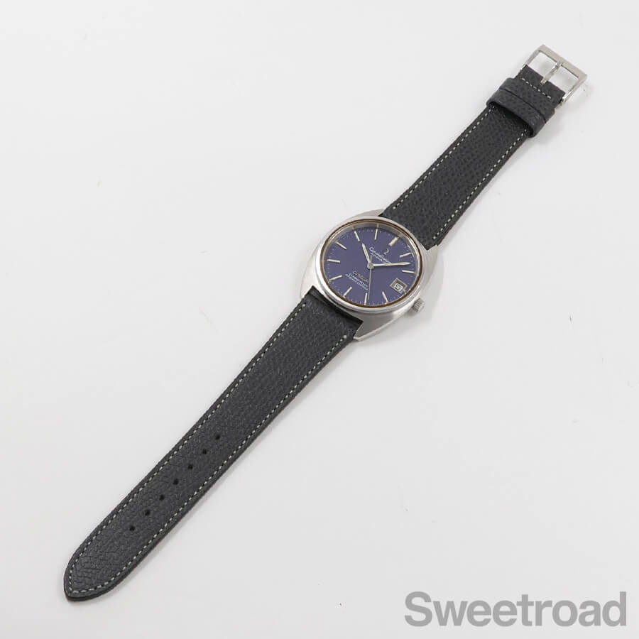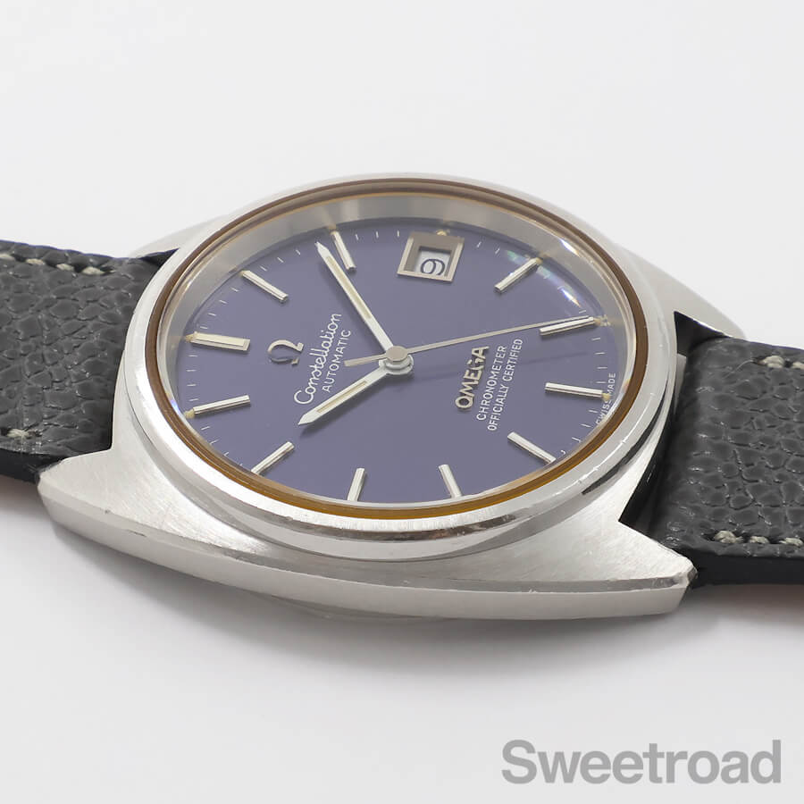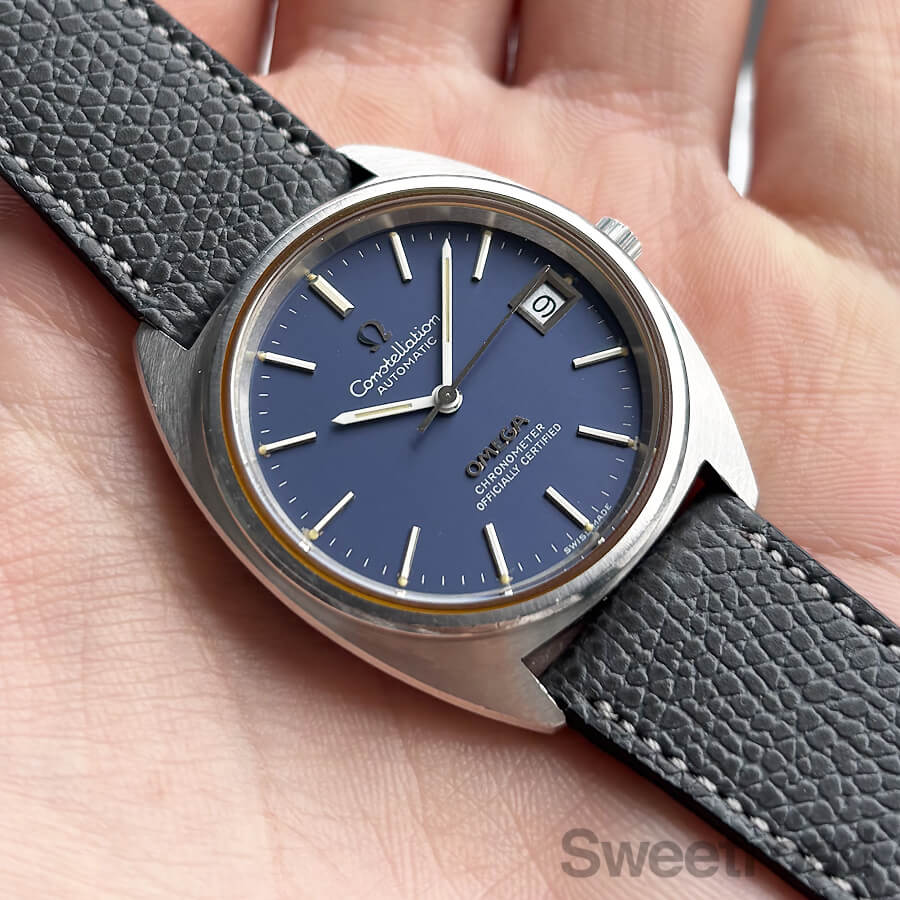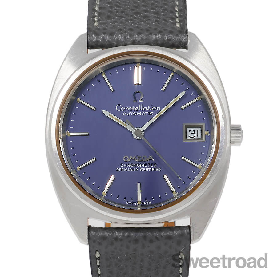 通称「Cライン/ジェンタ」と呼ばれる、オメガ・コンステレーションが入荷しました。 パテックのノーチラス、オーデマピゲのロイヤルオークなどを手掛けた「ジェラルド・ジェンタ氏」がデザインした、非常に人気のあるモデルです。 本商品は、OMEGAロゴやクロノメーター表記が6時側に配され、フラットなガラス風防が採用された後期型の個体です。 希少性の高いブルーダイヤルが採用されており、ホワイトカラーの針やインデックスが良いアクセントになっています。 Ωロゴに焼け、インデックス夜光周りにわずかな剥がれこそございますが、その他は目立つような傷みの見られない綺麗な状態を維持しています。 外装は細かな小傷が見受けられますが、打痕などの過度なダメージはありません。 ケースエッジやヘアラインは残っており、フォルムが維持された良好なコンディションです。 ムーブメントは、デイト付きクロノメーターキャリバー「1011」を搭載しています。 ベルトは、アキュレイトフォルムのレザーベルトが装着されています。 当店にてOH(分解掃除)を行っております。