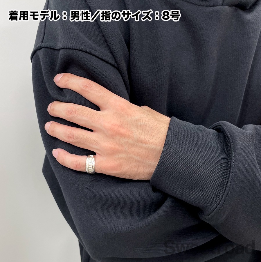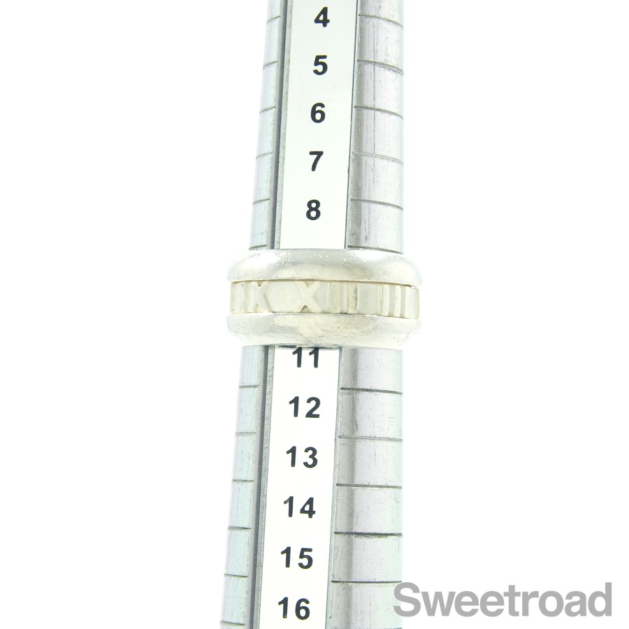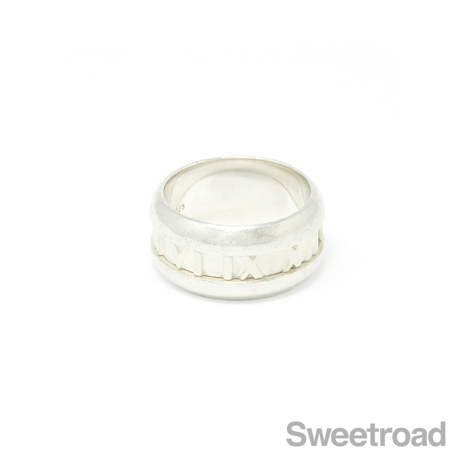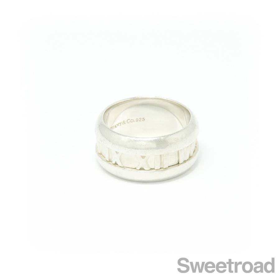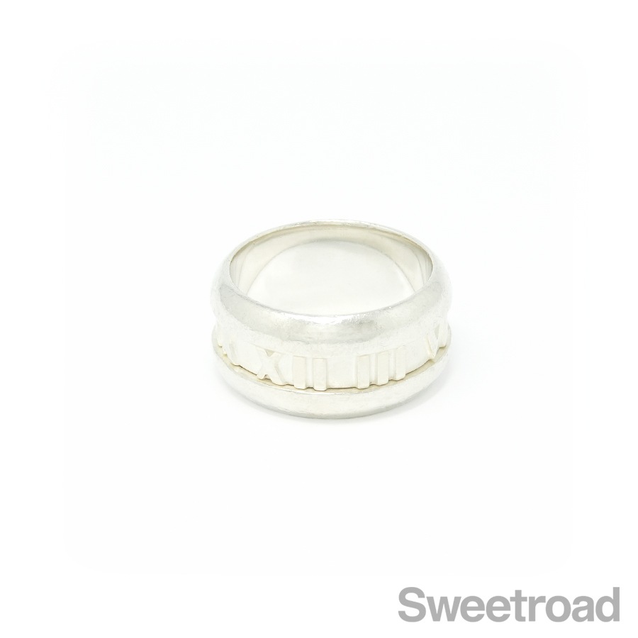 グラフィカルなローマ数字が目を惹く、ティファニーの「アトラスリング」。一目でティファニーとわかるデザインが魅力的なユニセックスなモデルです。幅が9mmのワイドサイズです。シルバー特有の小傷こそございますが、全体的に目立つような過度なダメージは見られません。ブランド名や素材を表す内側の刻印はしっかりと残っています。