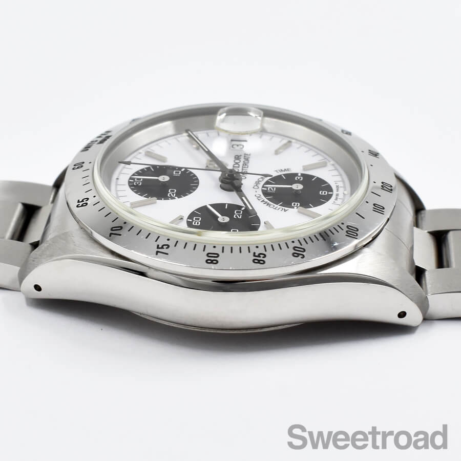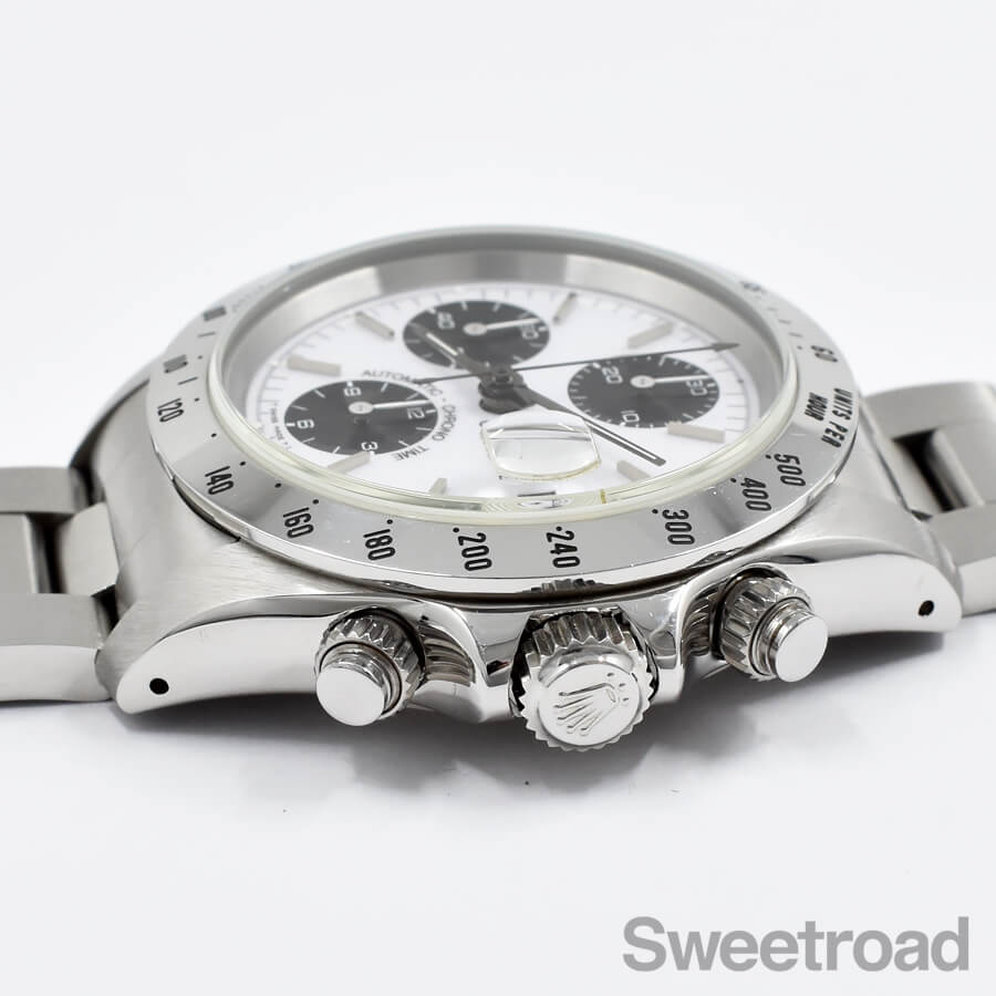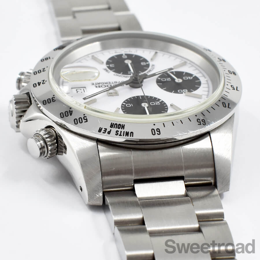 文字盤は、ホワイトにブラックのインダイヤルが配された、通称「パンダダイヤル」と呼ばれる人気の顔立ち。