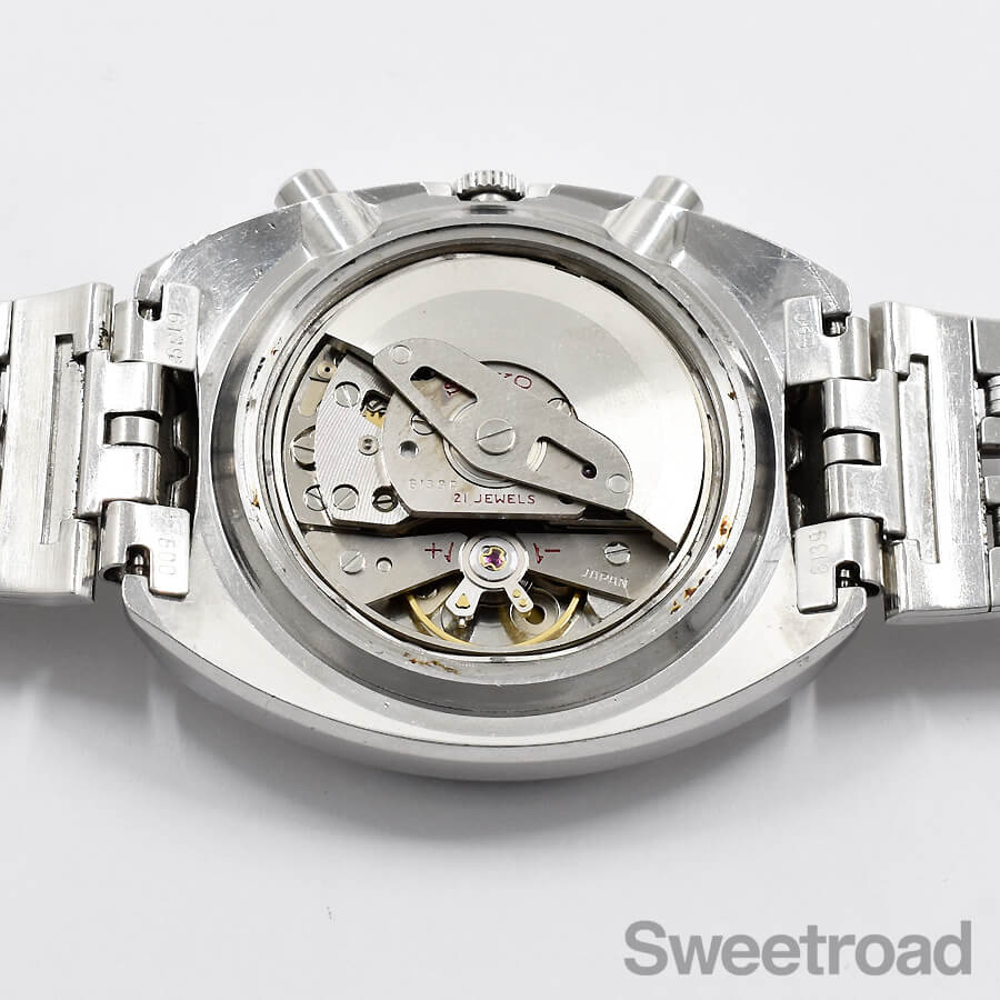 ムーブメントは世界で最初に製品化された自動巻クロノグラフ/Cal.6139Aを搭載しており、日英二か国語表記の国内仕様です。