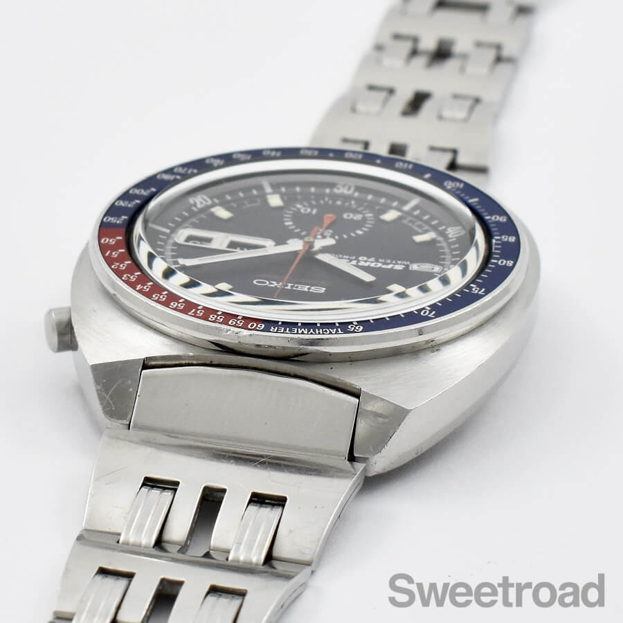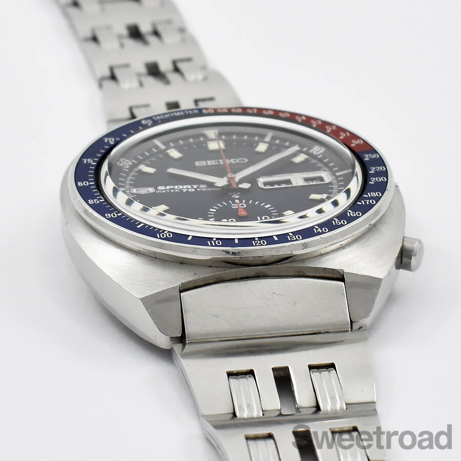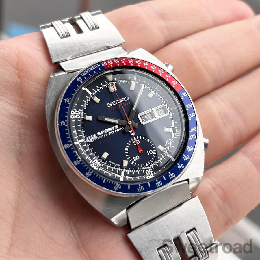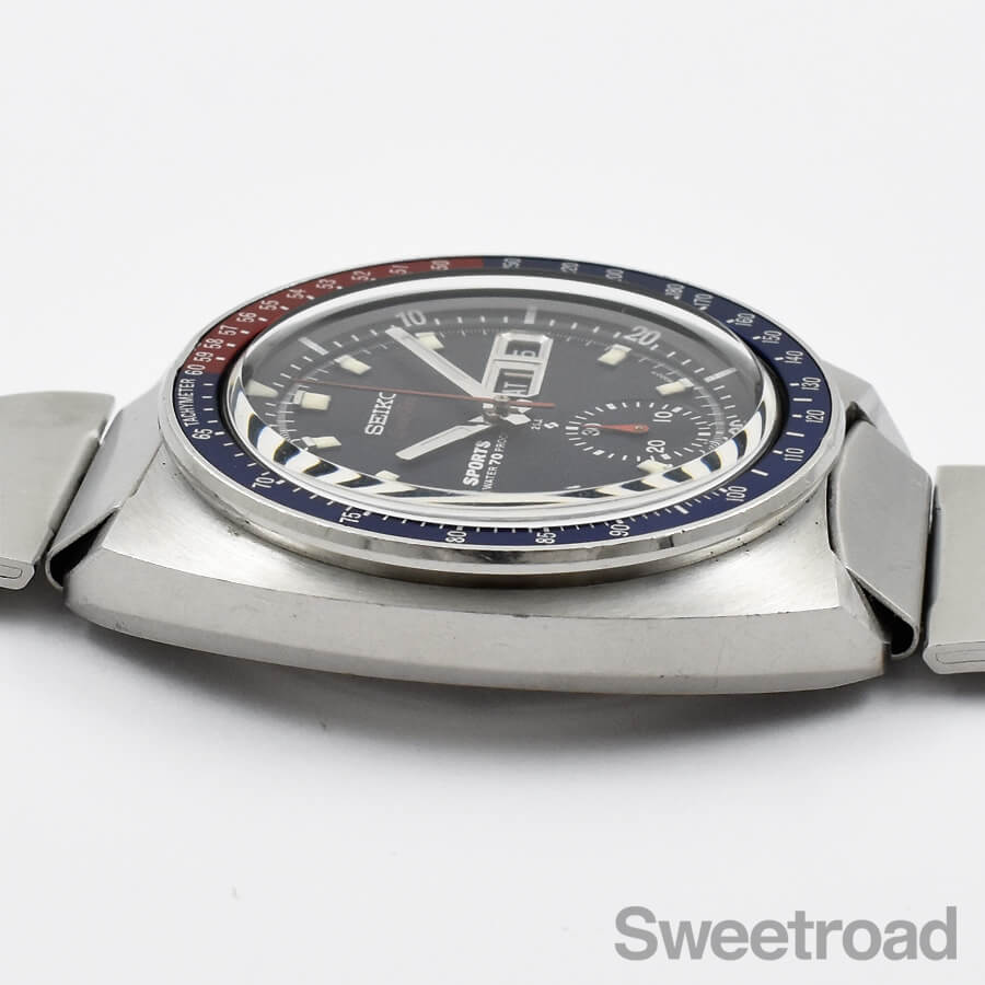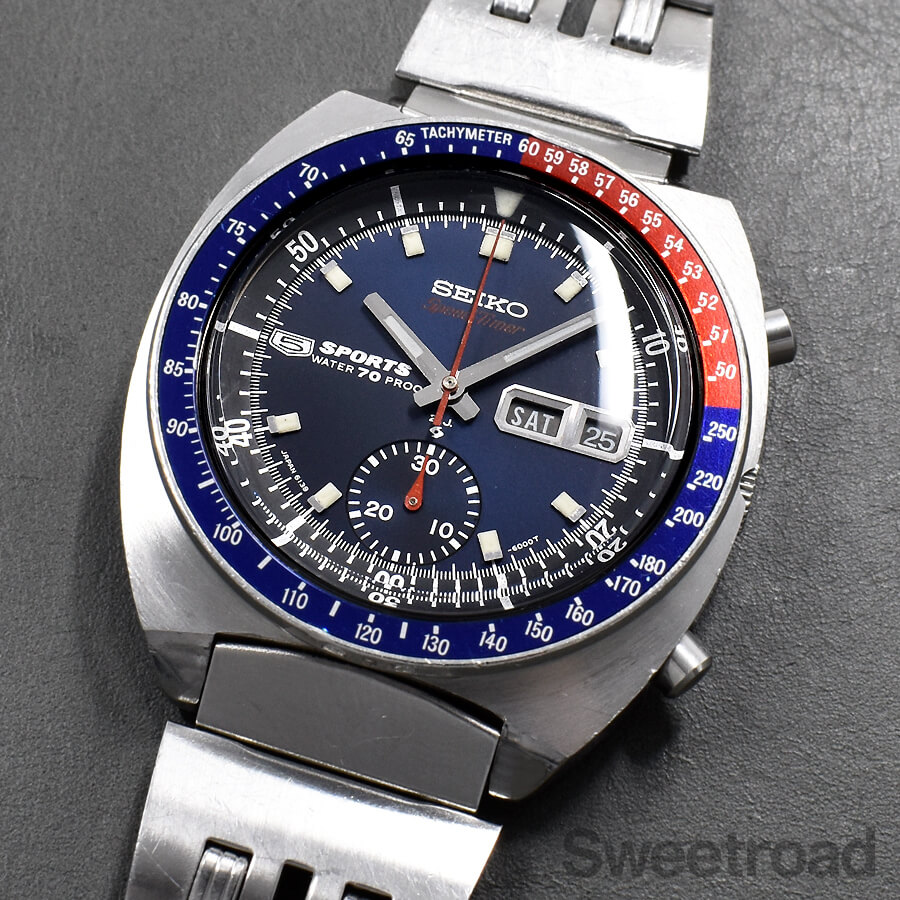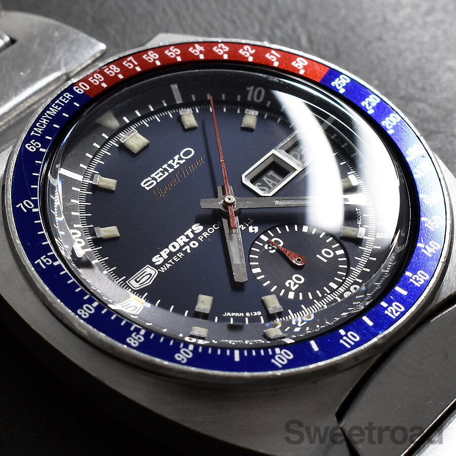 「ペプシベゼル」とも呼ばれる鮮やかな赤青ツートンベゼルを装備したセイコーの人気モデル「5スポーツ・スピードタイマー/Ref.6139-6000」が入荷しました。 同モデルの中でも初期型の個体で、裏蓋の「WATERPROOF」表記や、ケースのリューズが収まる部分に切り欠けが採用されているなど、後期型には見られない細かなディティールの違いがございます。