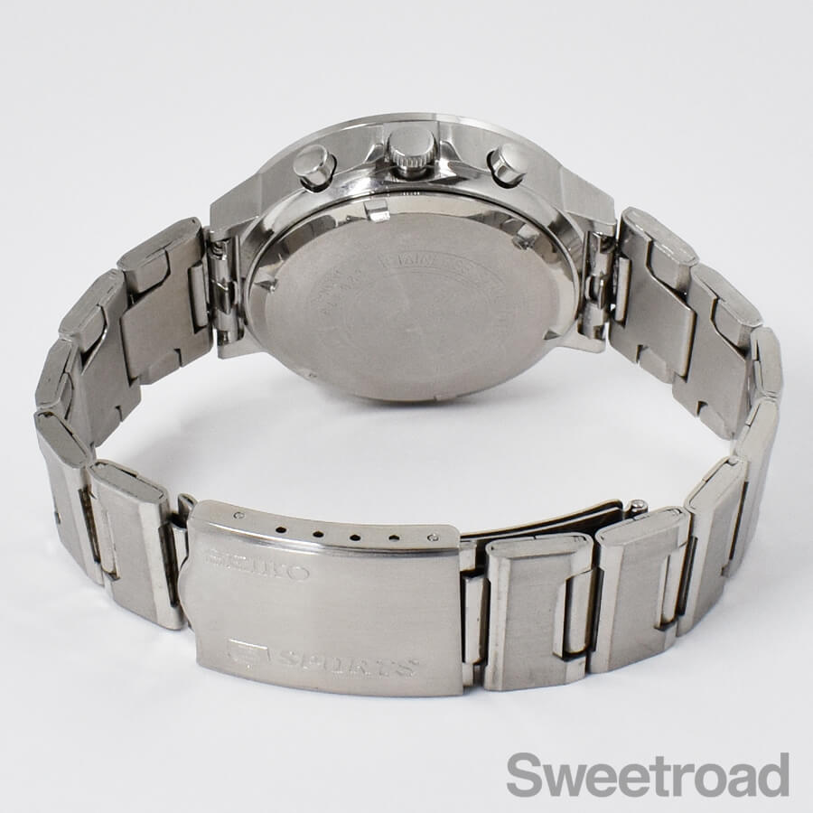 ベルトは「SEIKO 5 SPORTS」刻印のバックルが付いたセイコー純正のステンレスブレスが装着されています。
