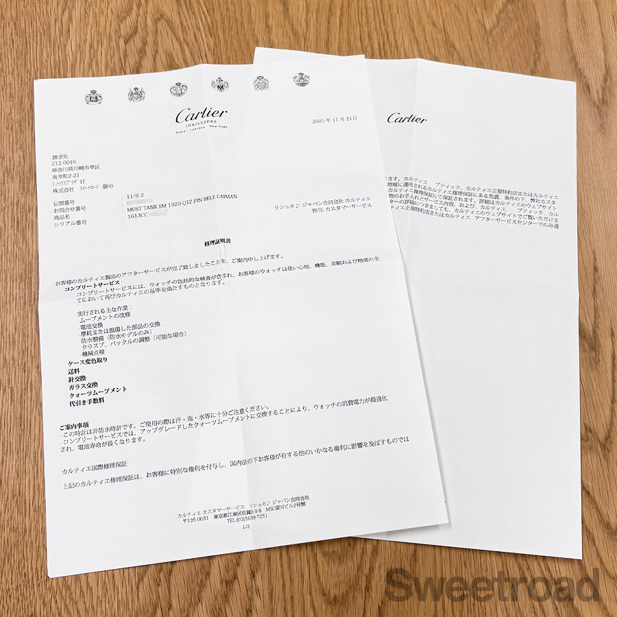2025年11月21日にカルティエのコンプリートサービスを受けており、メーカーの2年間保証が付いています。