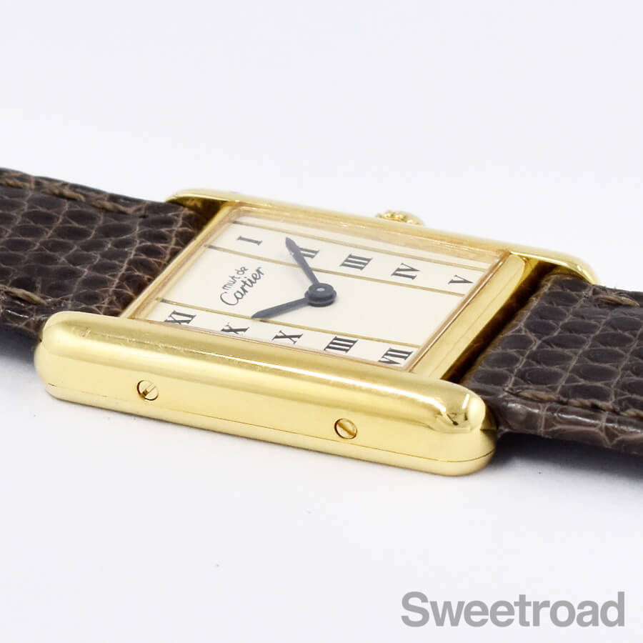 文字盤には目立つような劣化は見られず、全体的に綺麗な顔立ちをしています。 ケースはスターリングシルバー(銀無垢)に20ミクロンもの金を貼り付けて作られた、カルティエを代表する「ヴェルメイユケース」が採用されています。