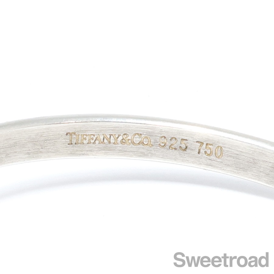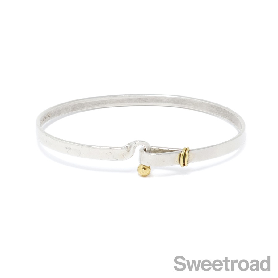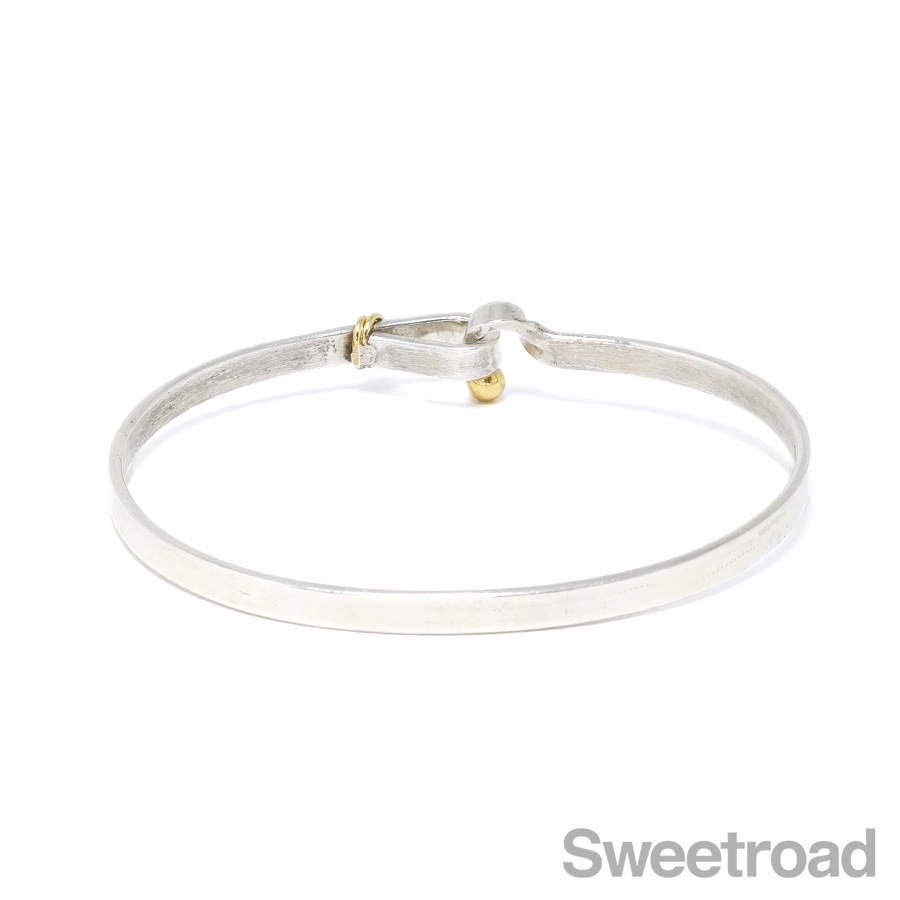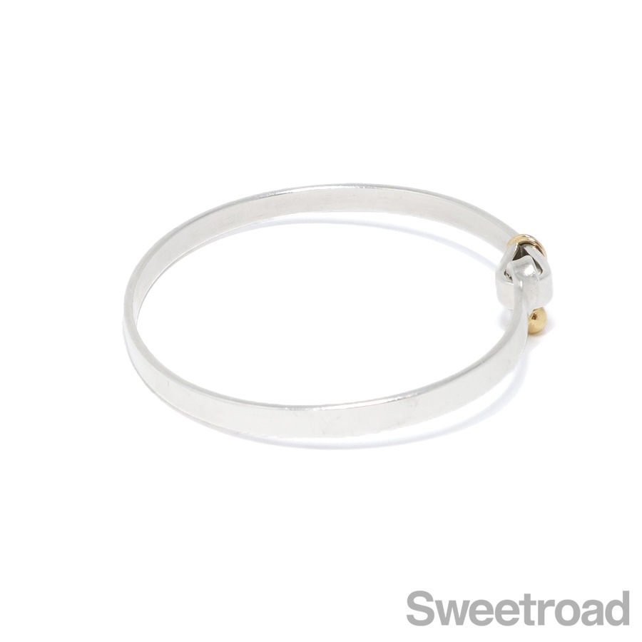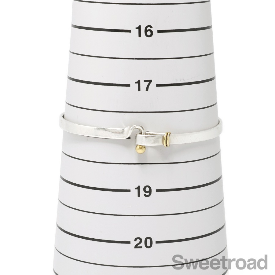 ティファニーの中でも高い人気を誇る「フックアンドアイ」シリーズのバングルが入荷しました。18金イエローゴールドがさりげなくも印象的なコンビモデルで、ティファニーらしい独創的なデザインが魅力的です。手首周り17.0cmくらいまでの方であれば余裕を持って身につけることができます。 シルバー特有の小傷こそございますが、雰囲気を損なうようなダメージはございません。 ブランド名や素材を表す刻印もしっかりと残っています。
