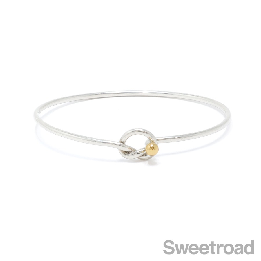 ティファニーコレクションの中でも高い人気を誇る「フックアンドアイシリーズ」より「ラブノットバングル」が入荷しました。 925シルバーと18金イエローゴールドが組み合わさった高級感のあるコンビモデルです。手首周り16.0cmくらいまでの方であれば余裕を持って身につけることができます。シルバー特有の若干の小傷がございますが、過度なダメージは見られません。内側の刻印はしっかりと残っています。