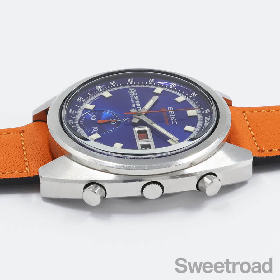 オレンジカラーのクロノ針が良いアクセントになった、この時代を象徴する個性的なカラーリングです。