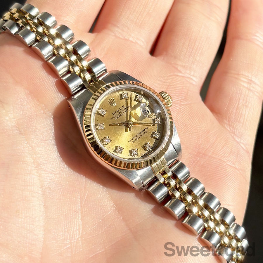 美しいサンレイ仕上げのシャンパンゴールドダイヤルに10Pダイヤが配されたラグジュアリーな佇まいが目を惹きます。