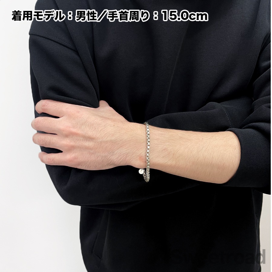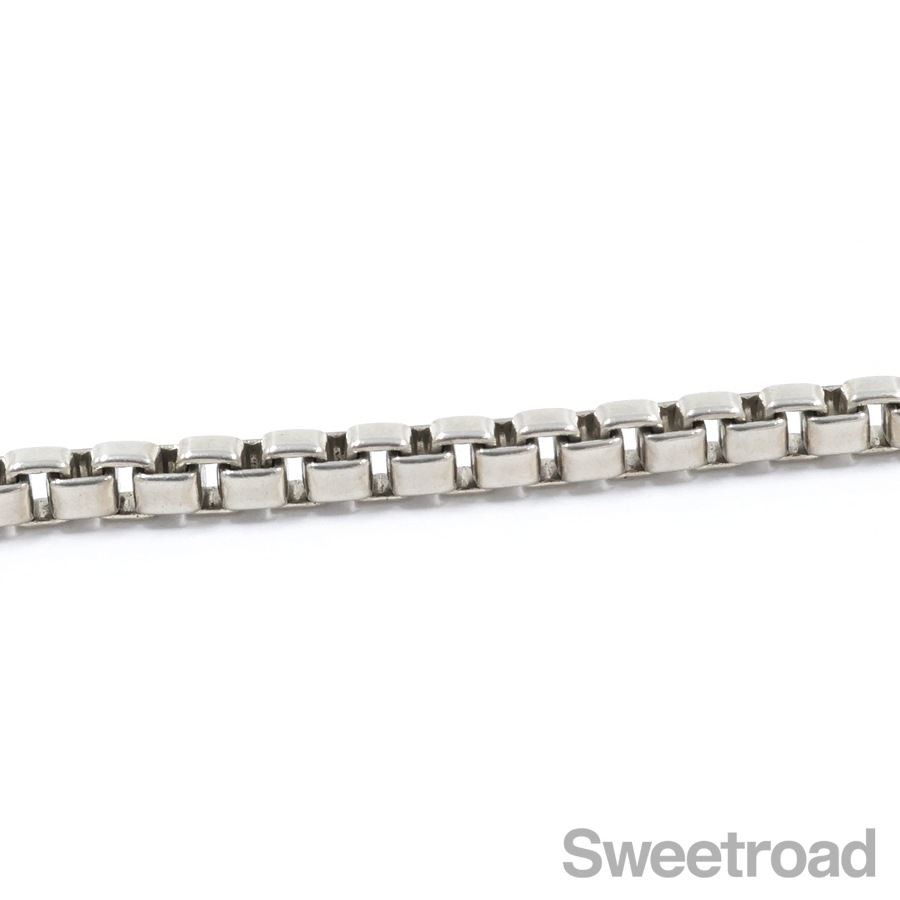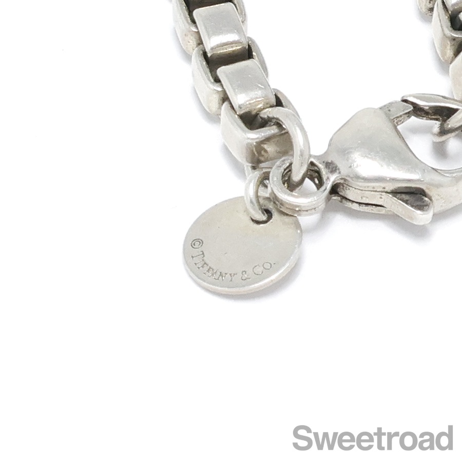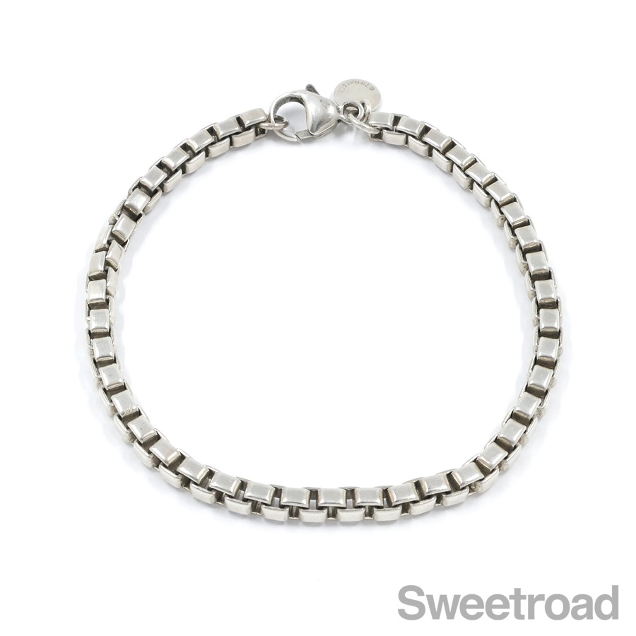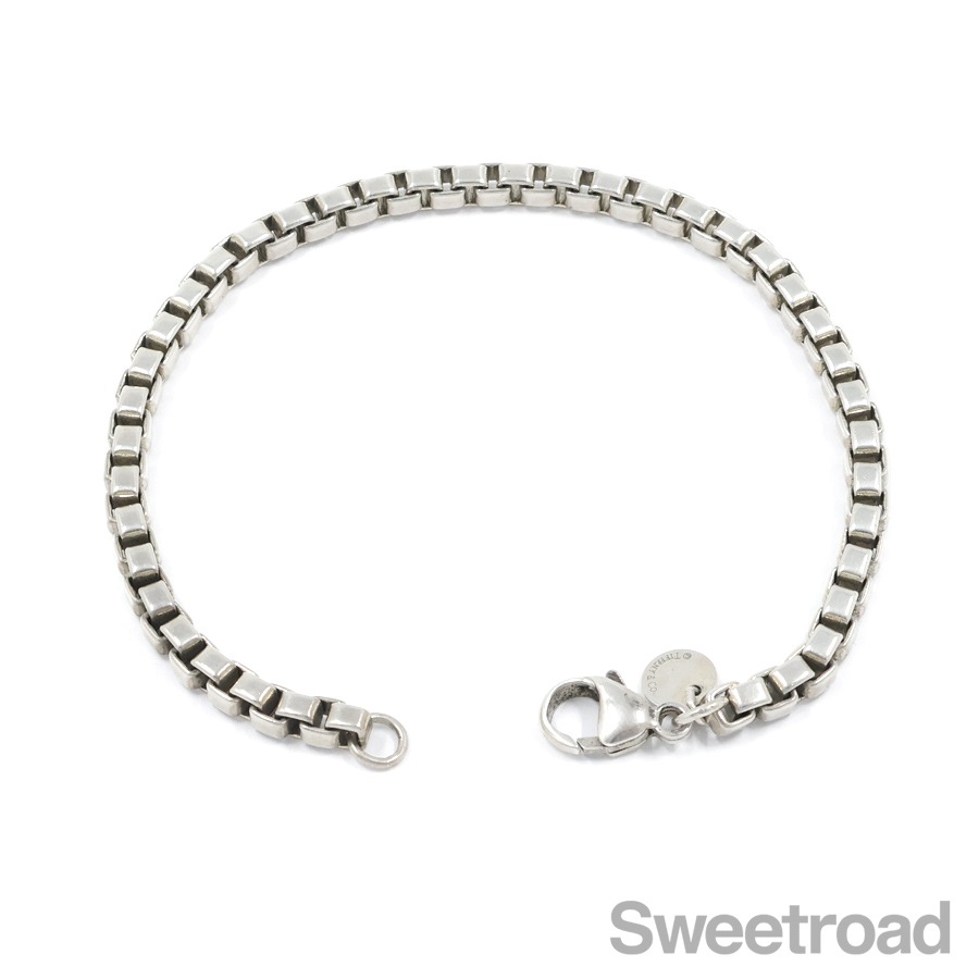 ティファニーで定番の「ベネチアンリンクブレスレット」。 古代ローマのアーチからインスピレーションを得たリンクを絡み合わせたシンプルながらも優美なデザインが魅力的なブレスレットです。 手首周り17.5cmくらいまでであれば余裕を持って身につけることができます。 シルバー特有の小傷こそございますが、雰囲気を損なうようなダメージは見られません。ブランド名や素材を表す刻印もしっかりと残っています。