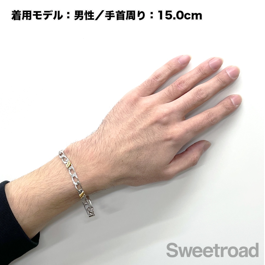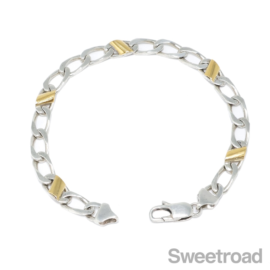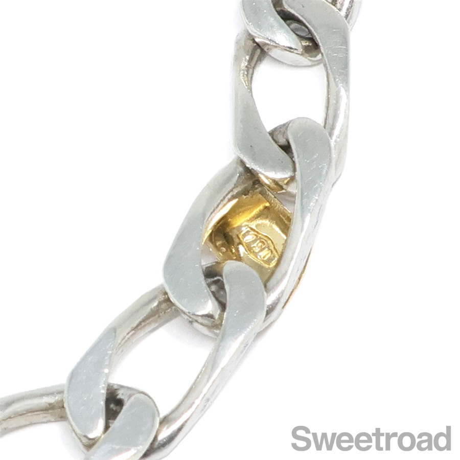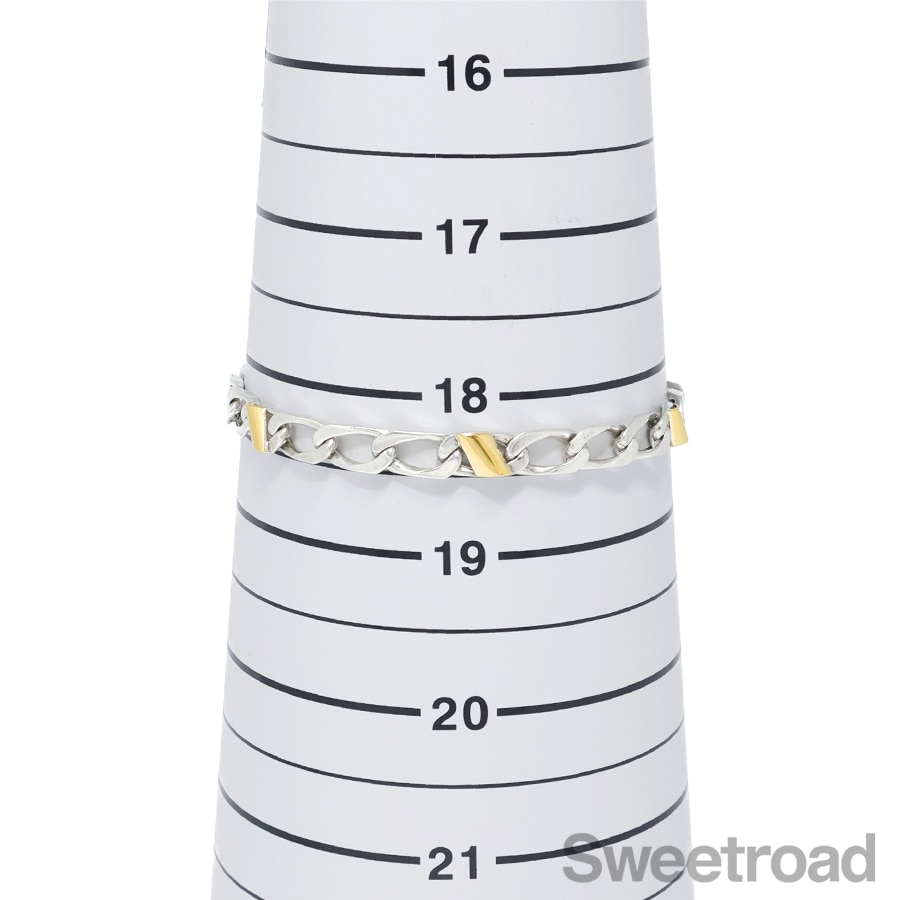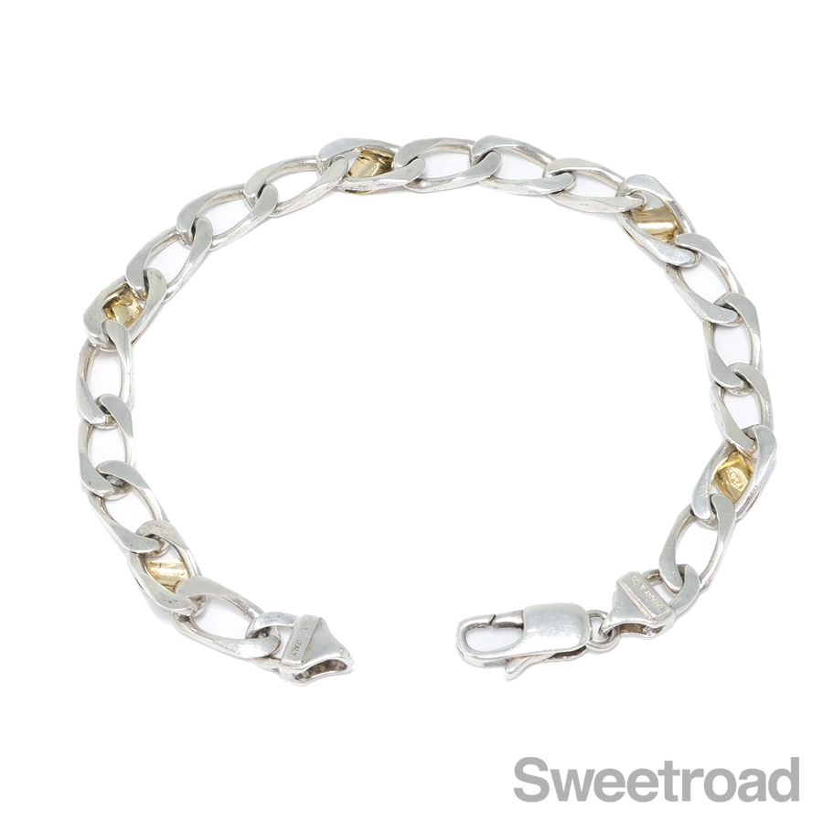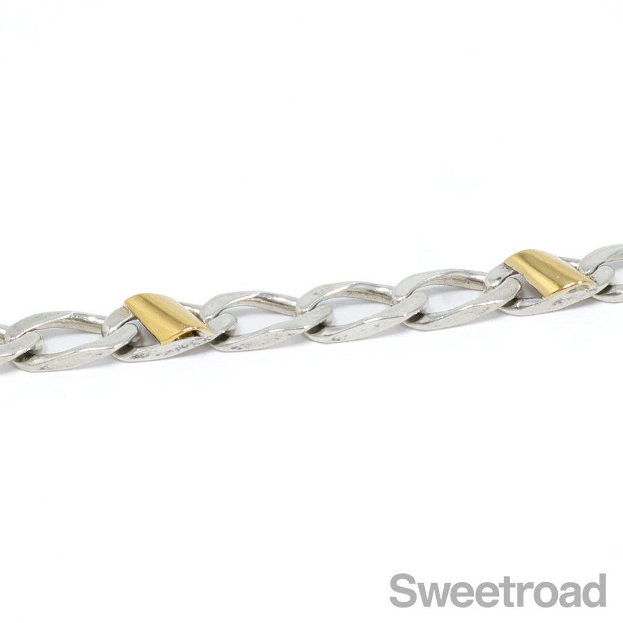 18金イエローゴールドと925シルバーが組み合わさった美しいデザインが魅力的なティファニーのチェーンブレスレットが入荷しました。上品で華やかな存在感のあるこちらのアイテムは、男女ともに着用可能なユニセックスモデルで、手首周り18.0cmくらいまで着用可能です。若干の小傷こそございますが、全体的に雰囲気を損なうようなダメージは見られません。刻印もしっかりと残っています。