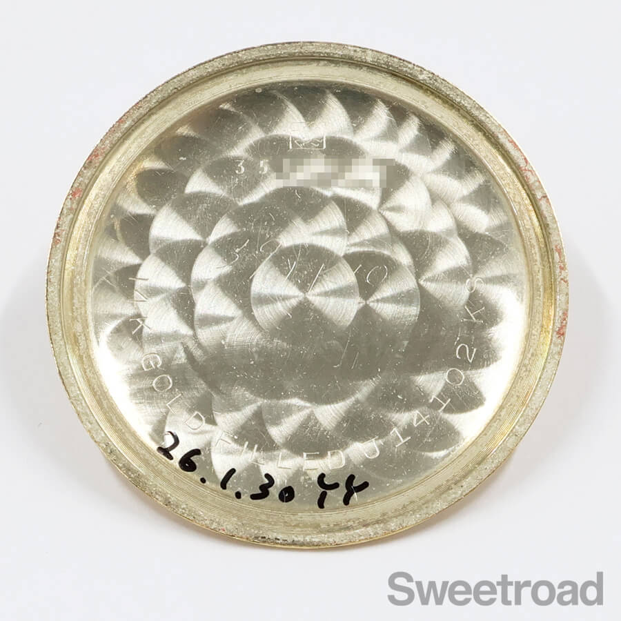 14金張りのケースには小傷が見受けられますが、雰囲気を損ねる剥がれはなく、ケースフォルムは維持しています。