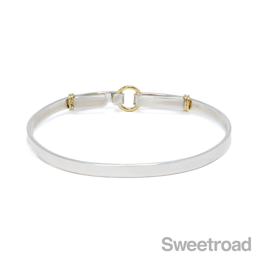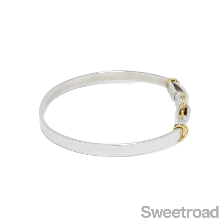 ティファニーの中でも高い人気を誇る「フックアンドアイ」シリーズの「ダブルバングル」が入荷しました。18金イエローゴールドがさりげなくも印象的なコンビモデルで、ティファニーらしい独創的なデザインが魅力的です。手首周り16.5cmくらいまでの方であれば余裕を持って身につけることができます。 シルバー特有の小傷こそございますが、雰囲気を損なうようなダメージはございません。 ブランド名や素材を表す刻印もしっかりと残っています。