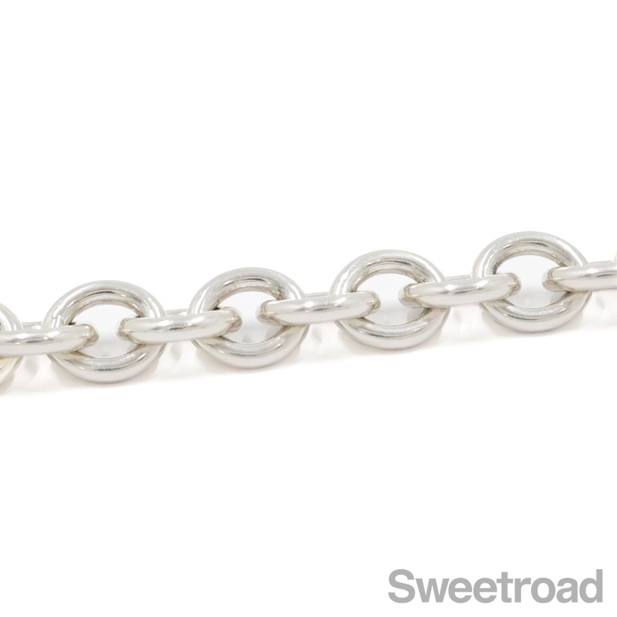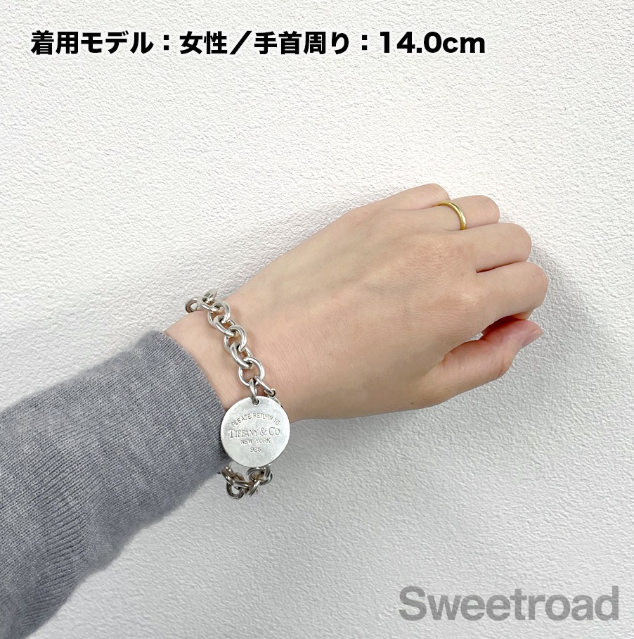 リターン・トゥ・ティファニーコレクションの一つ「ラウンドタグ・チャームブレスレット」。 アイコニックなラウンドチャームが揺れ動く、男性でも女性でも着けやすいユニセックスなアイテムです。手首周り16.5cmくらいまでであれば余裕をもって身につけることができます。手前のリングにナスカンを通すことでより短く装着することも可能です。シルバー特有の小傷こそございますが、全体的に目立つようなダメージは見られません。刻印はしっかりと残っています。