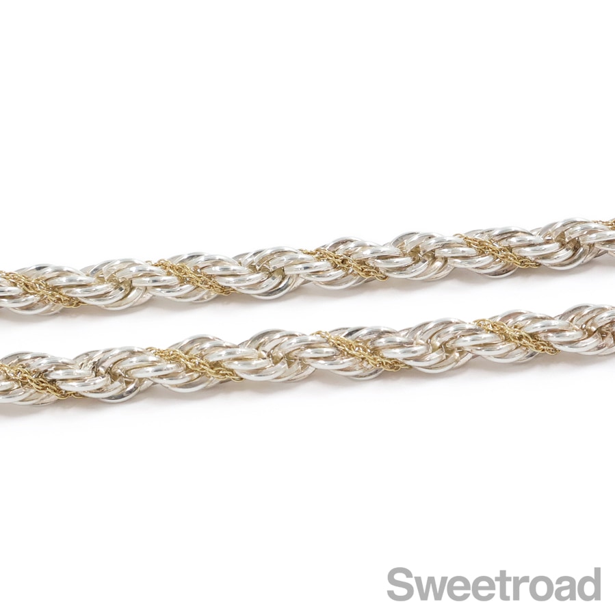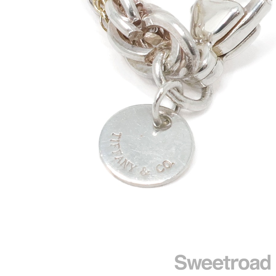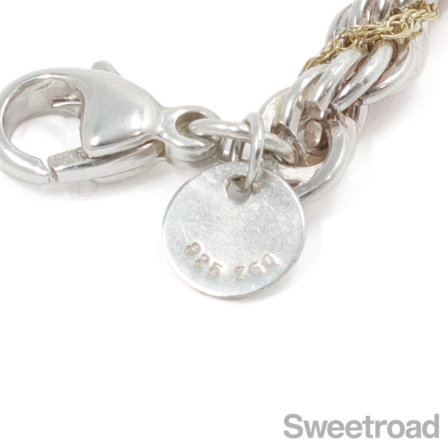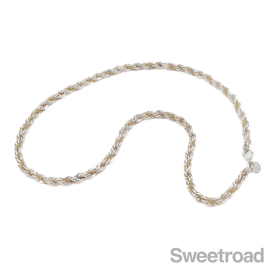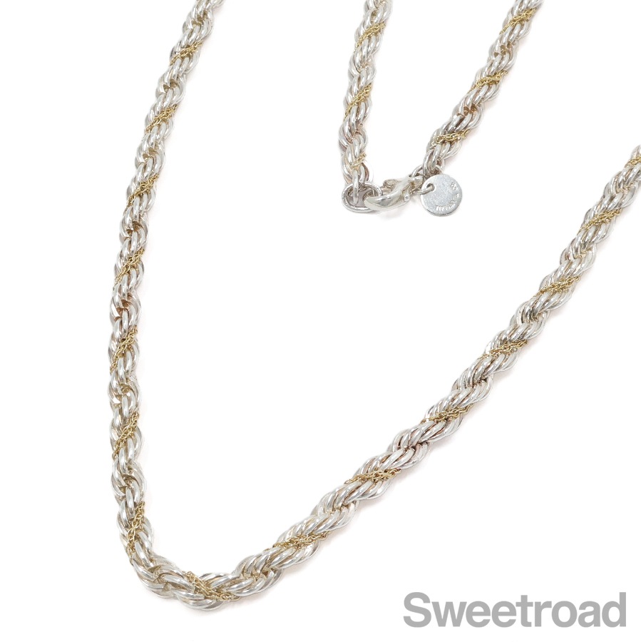 チェーンを絡み合わせた繊細な造りが魅力的な、ティファニーの「ツイストチェーンネックレス」。18金イエローゴールドと925シルバーのコンビモデルで、ティファニーらしい上品で高級感のあるデザインが目を惹きます。若干の小傷こそございますが、全体的に雰囲気を損なうようなダメージは見られません。ブランド名や素材を表す刻印はしっかりと残っています。